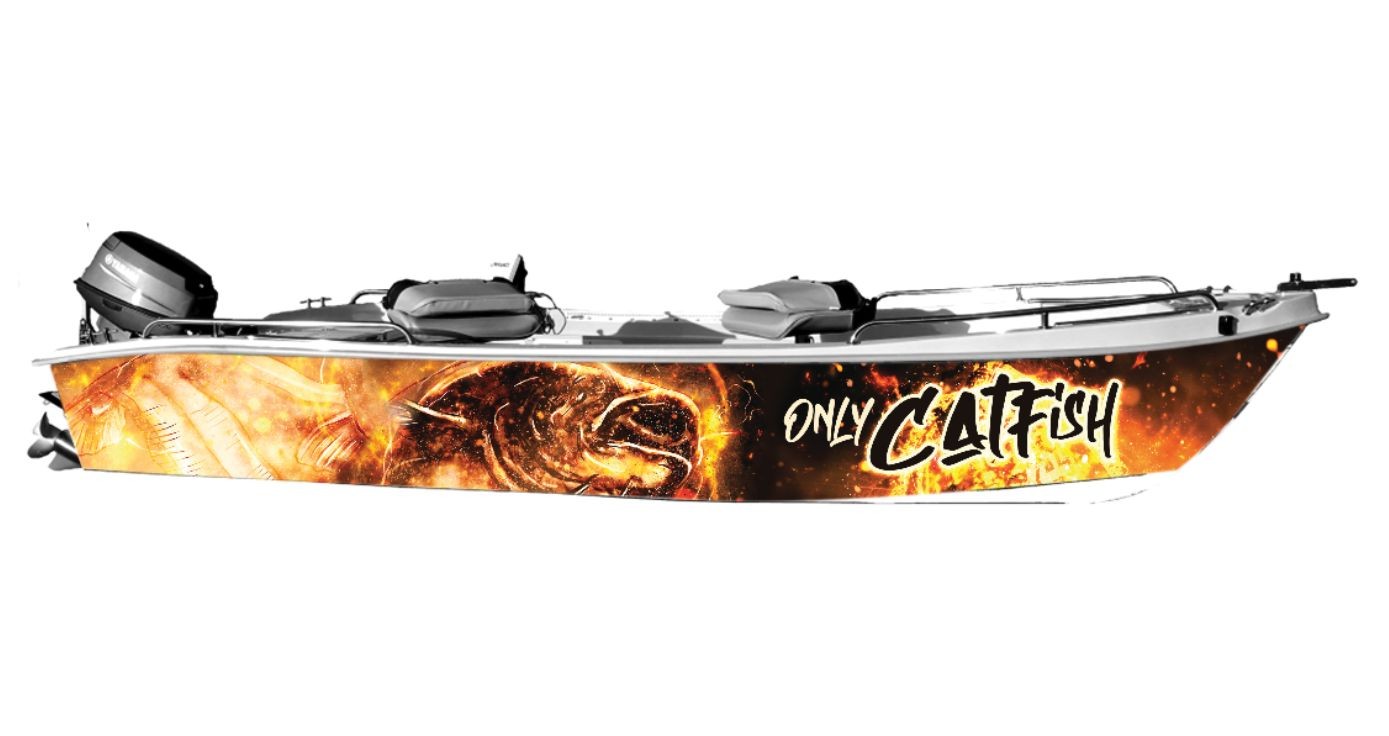 Podkreśl pasję do wędkowania i niepowtarzalny styl z okleiną „Only Catfish”. Ognisty design w czerni z pomarańczowo-żółtymi akcentami płomieni i wizerunkiem suma nadaje łodzi dzikości i energii, wyróżniając ją z daleka.
