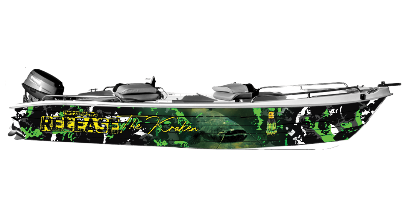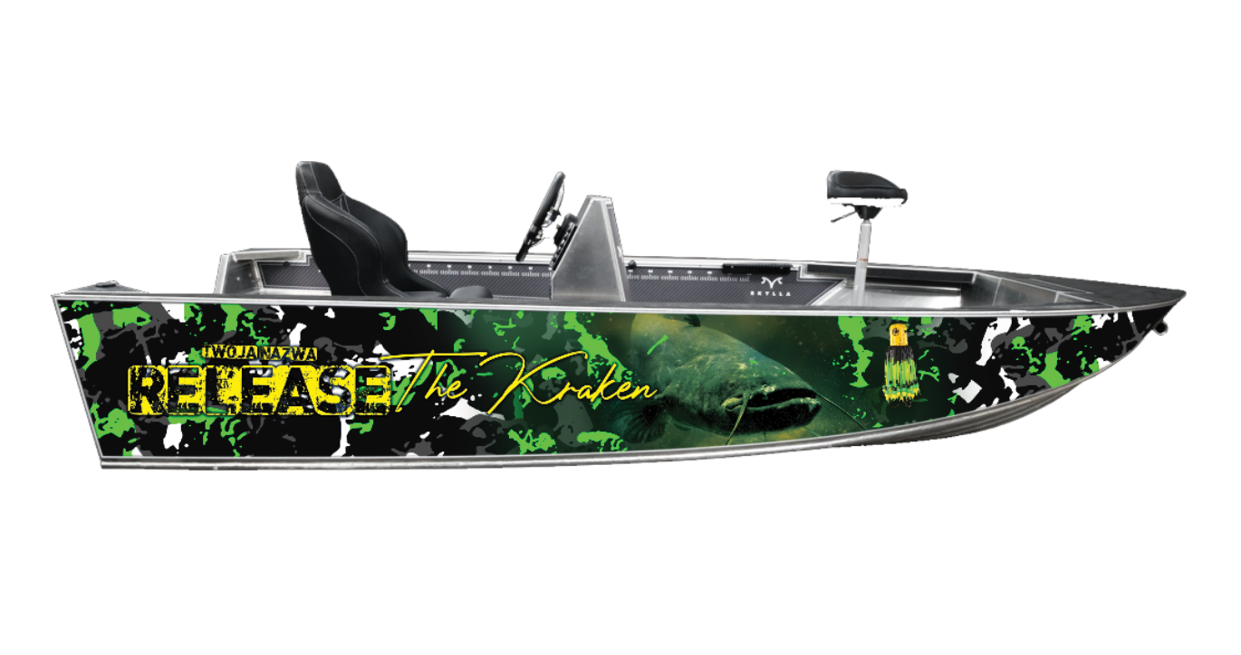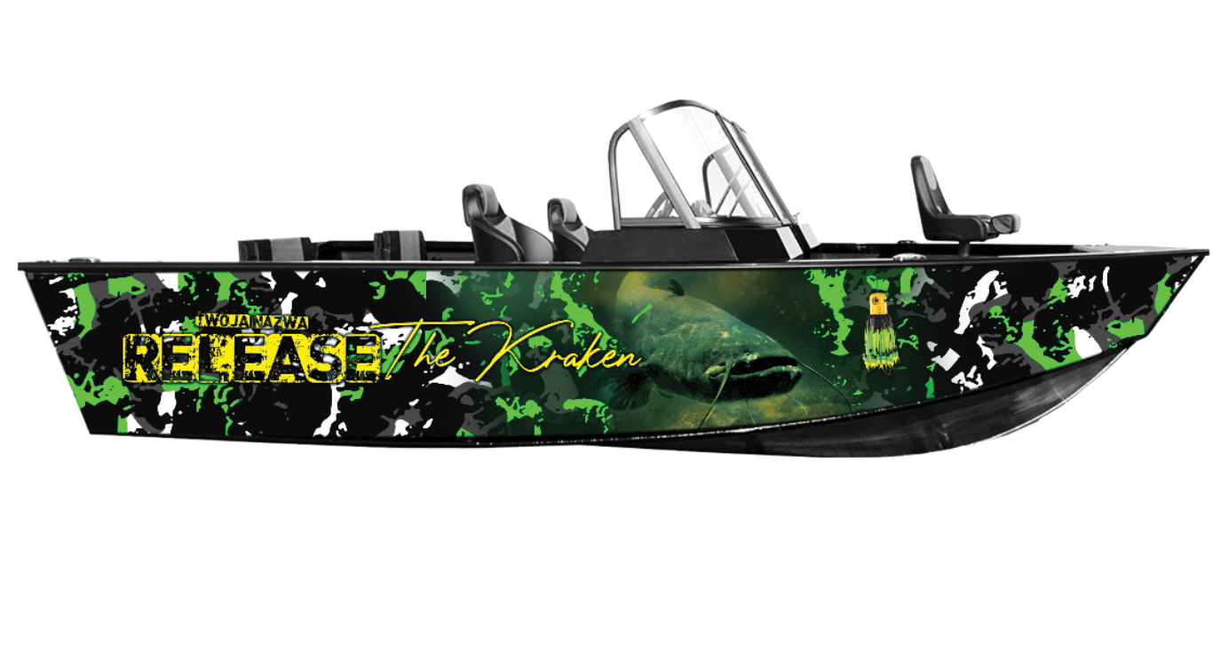 Okleina łodzi dla łowców sumów – Release the Kraken w zielonych barwach! Grafika na łódkę z motywem sumowym, okleina łodzi z wędkarską personalizacją na każdy model. Drukujemy i oferujemy pro oklejanie łódek folią 3M z laminatem UV – mega trwała na wodę i słońce. Projekty graficzne na łodzie wędkarskie z vibe'em "wypuść bestię" – idealne dla aktywnych wędkarzy polujących na sumy. Dodaj swój twist i dominuj na rzece!