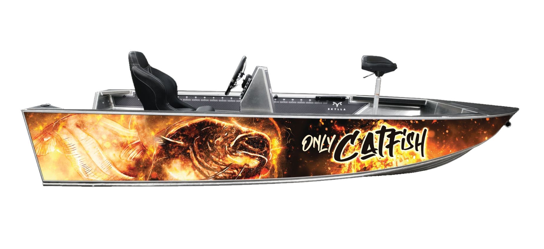 Podkreśl pasję do wędkowania i niepowtarzalny styl z okleiną „Only Catfish”. Ognisty design w czerni z pomarańczowo-żółtymi akcentami płomieni i wizerunkiem suma nadaje łodzi dzikości i energii, wyróżniając ją z daleka.